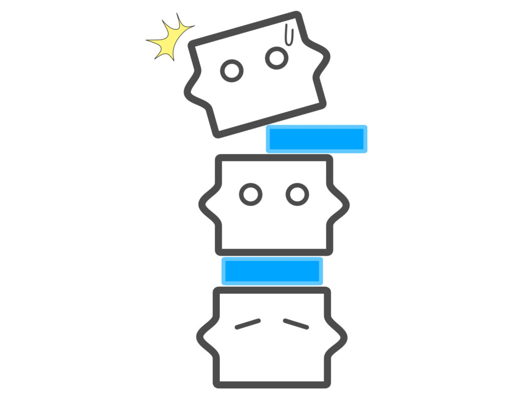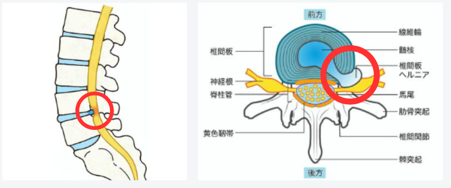 椎間板というスポンジが突出したせいで、すぐそばにある脊髄を圧迫してしまうことで症状が出てきます。