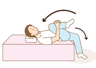 足をベッドから下ろした状態で片足を抱え込んで膝と胸を近付けます。ベッドから足を下ろすことで伸ばすことが出来る筋肉が異なり、太もも前にある大腿直筋を伸ばすことが出来ます。